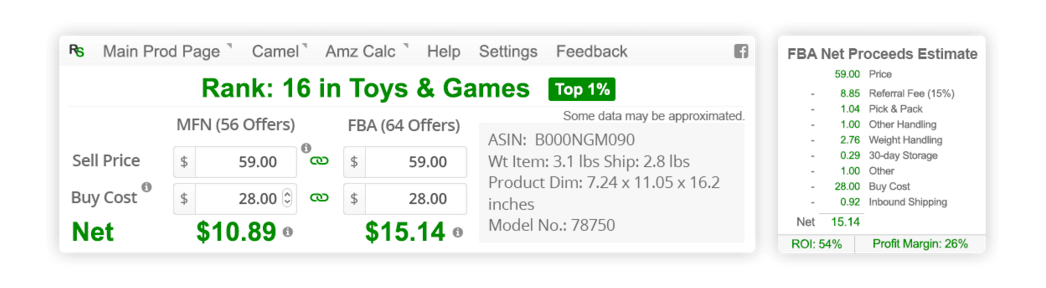 It saves me a significant amount of time by providing information on each amazon listing, right at the top of the page. It is nice seeing the rank and category, ASIN, weight, etc. Then there’s the extra data: net payout after amazon fees whether merchant fulfilled or FBA; the opportunity to plug in different prices and check to see what the net payout would be; and the rank percentage in the particular category. I also really like having the quick link to Camel, Camel, Camel.”